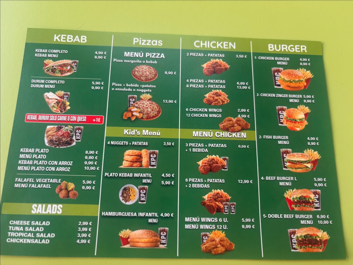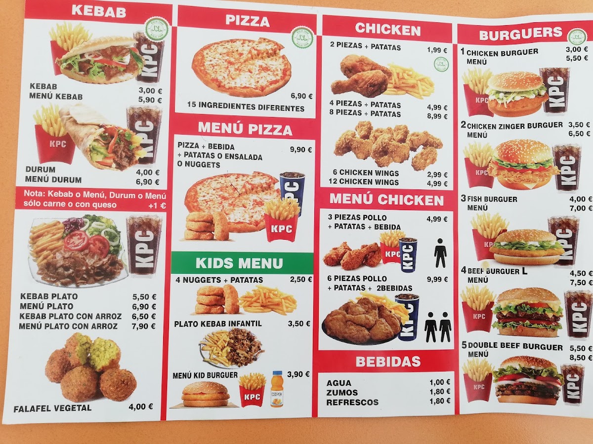 Welcome to KPC - Spain, a delightful halal restaurant nestled in the heart of Salou. Located at Av. Pere Molas, this culinary gem promises to take your taste buds on a flavorful journey. The menu features a variety of delicious options, from savory kebabs in pita and durum wraps starting at just €4.90, to tempting pizzas and juicy burgers that appeal to all ages. Highlights include the classic Margherita pizza, bursting with fresh mozzarella, and the Chicken Zinger Burger, a must-try for chicken lovers.